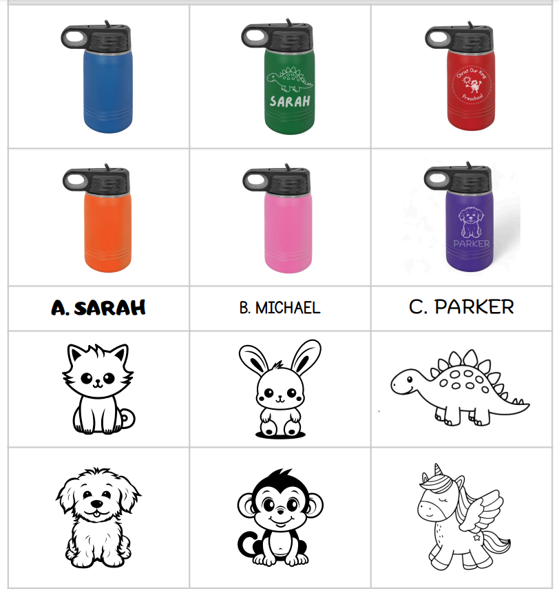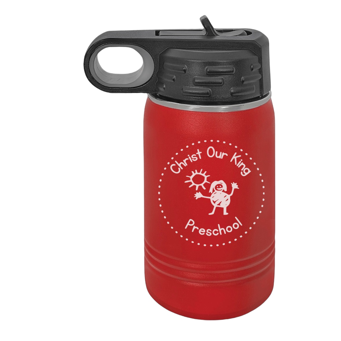 Each bottle is personalized with your child's name on one side and the Christ Our King Preschool logo on the other, creating a unique and functional keepsake. Available with adorable designs, this water bottle makes hydration fun and personalized.