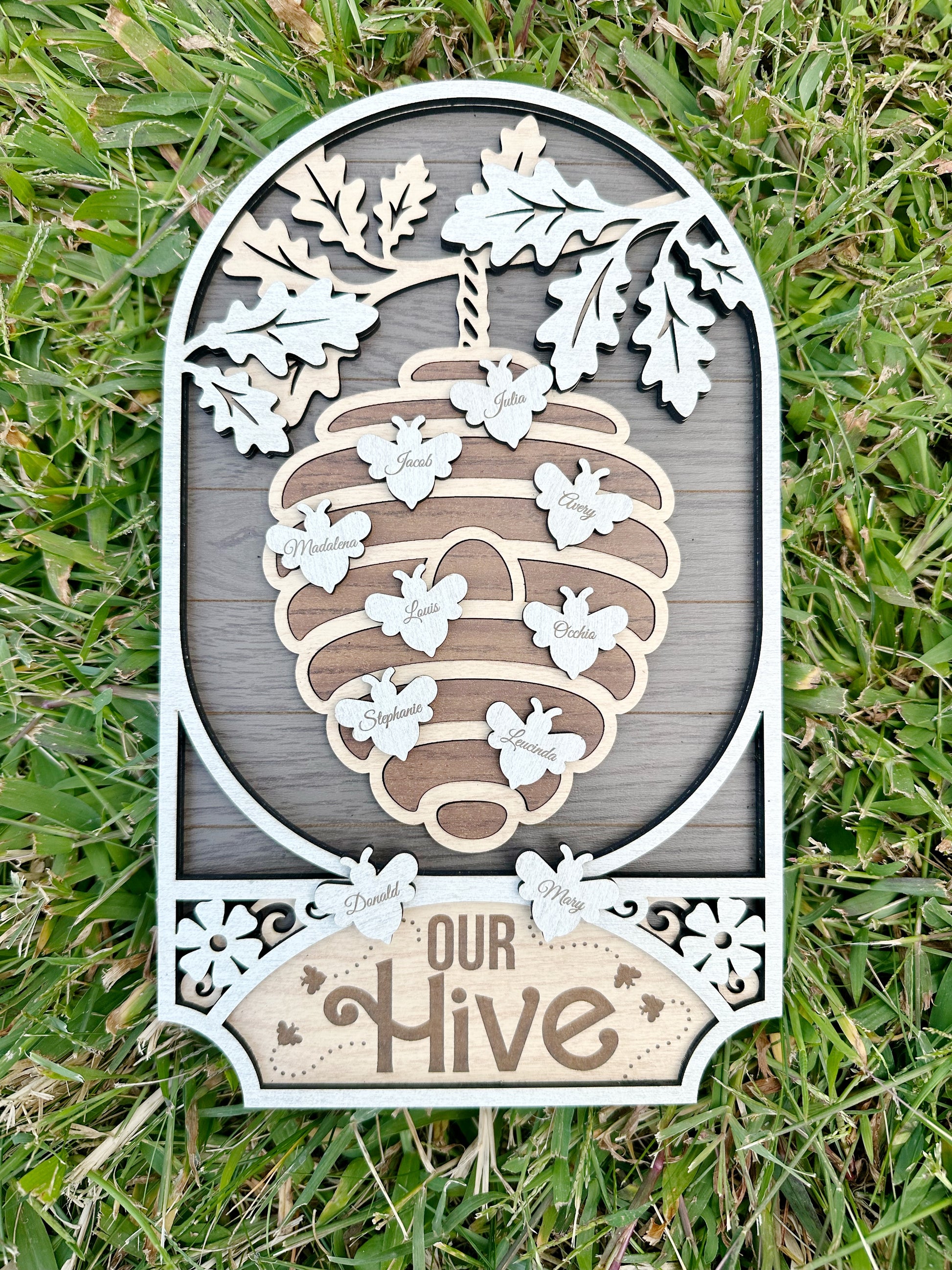 Bring warmth, charm, and a touch of whimsy to your home with our Personalized Bee Family Sign. This beautifully crafted wooden plaque features a beehive design with the phrase “Our Hive” engraved, surrounded by buzzing little bees—each one customized with the names of your family members.